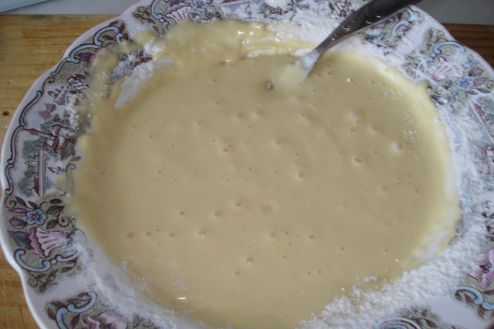 Num recipiente colocar todos os ingredientes excepto a farinha e envolver muito bem com as varas para homogeneizar. Agora vai-se adicionando a farinha , mexendo sempre até ficar com consistência cremosa.