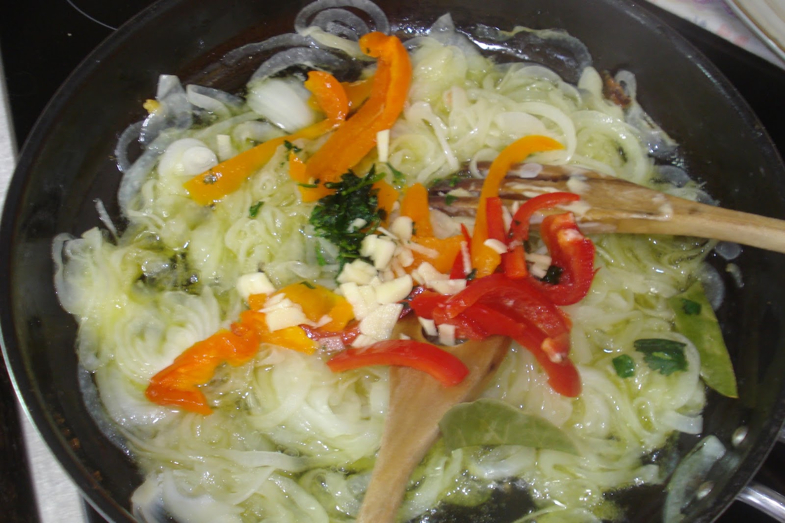Colocar numa frigideira o azeite ( generoso ) e adicionar a cebola e os pimentos com a folha de louro.